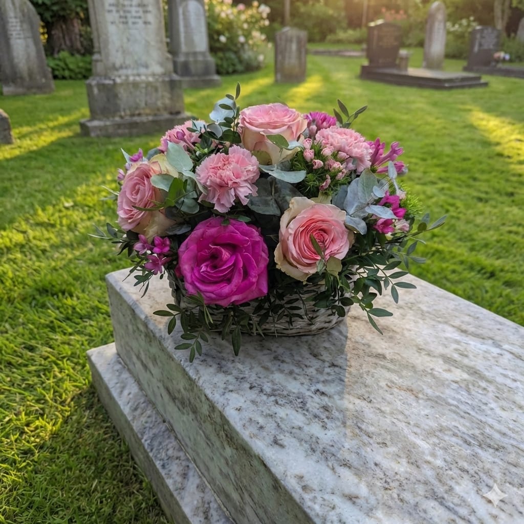 Ce panier de deuil délicat associe des roses fuchsia éclatantes et des roses rose poudré, accompagnées d'œillets roses et d'eucalyptus. Composé avec soin dans un panier en osier naturel, cet arrangement floral exprime avec élégance votre sympathie et votre soutien.